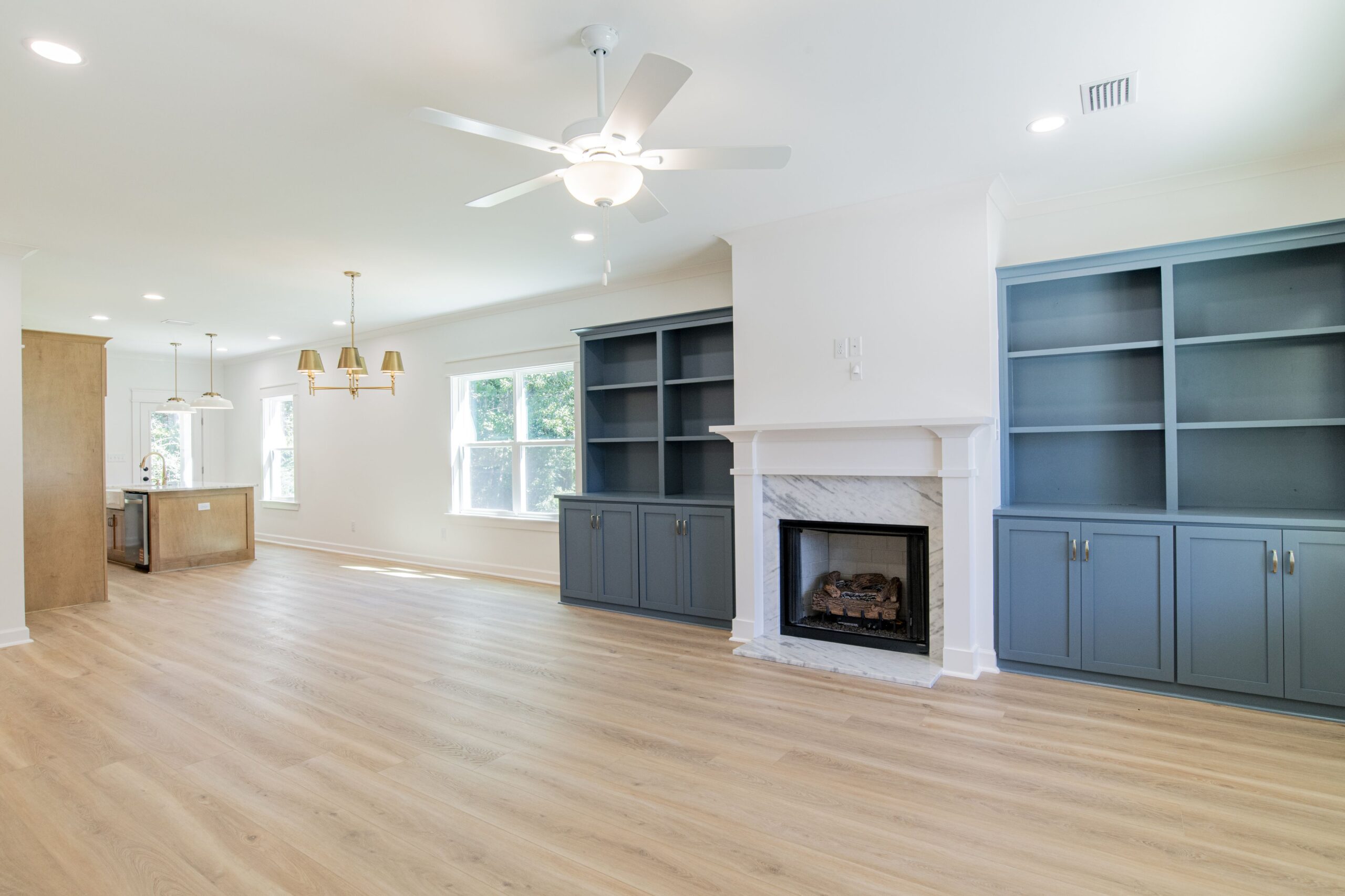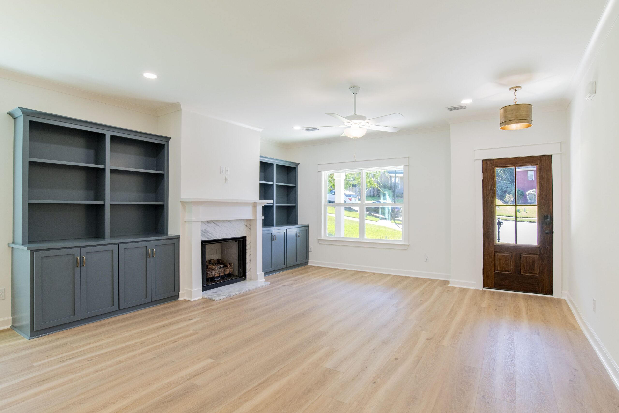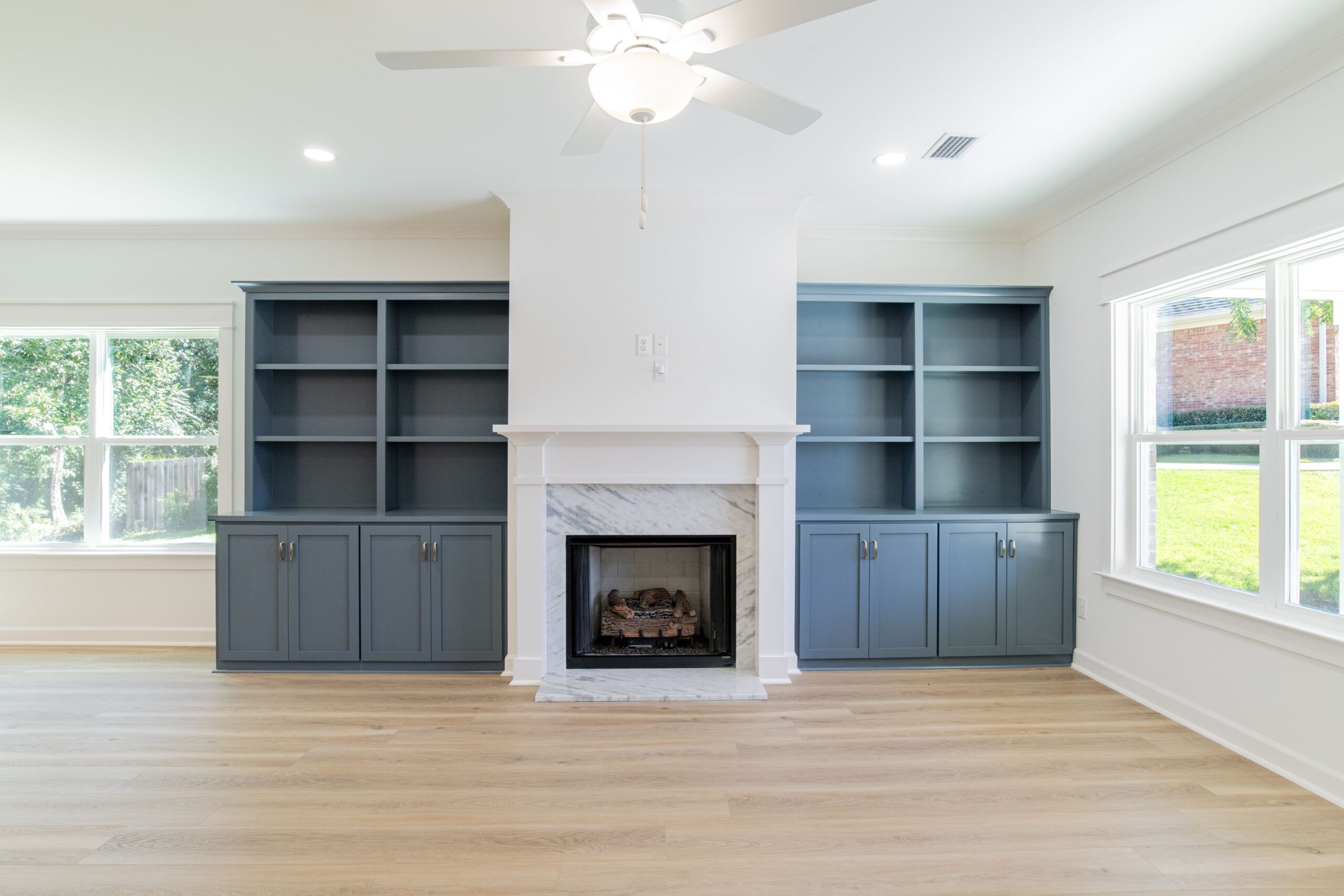 To your right, the spacious living room showcases a gas fireplace with a granite inset and hearth, framed by custom built-in bookshelves — creating the perfect focal point for family gatherings or quiet evenings at home.