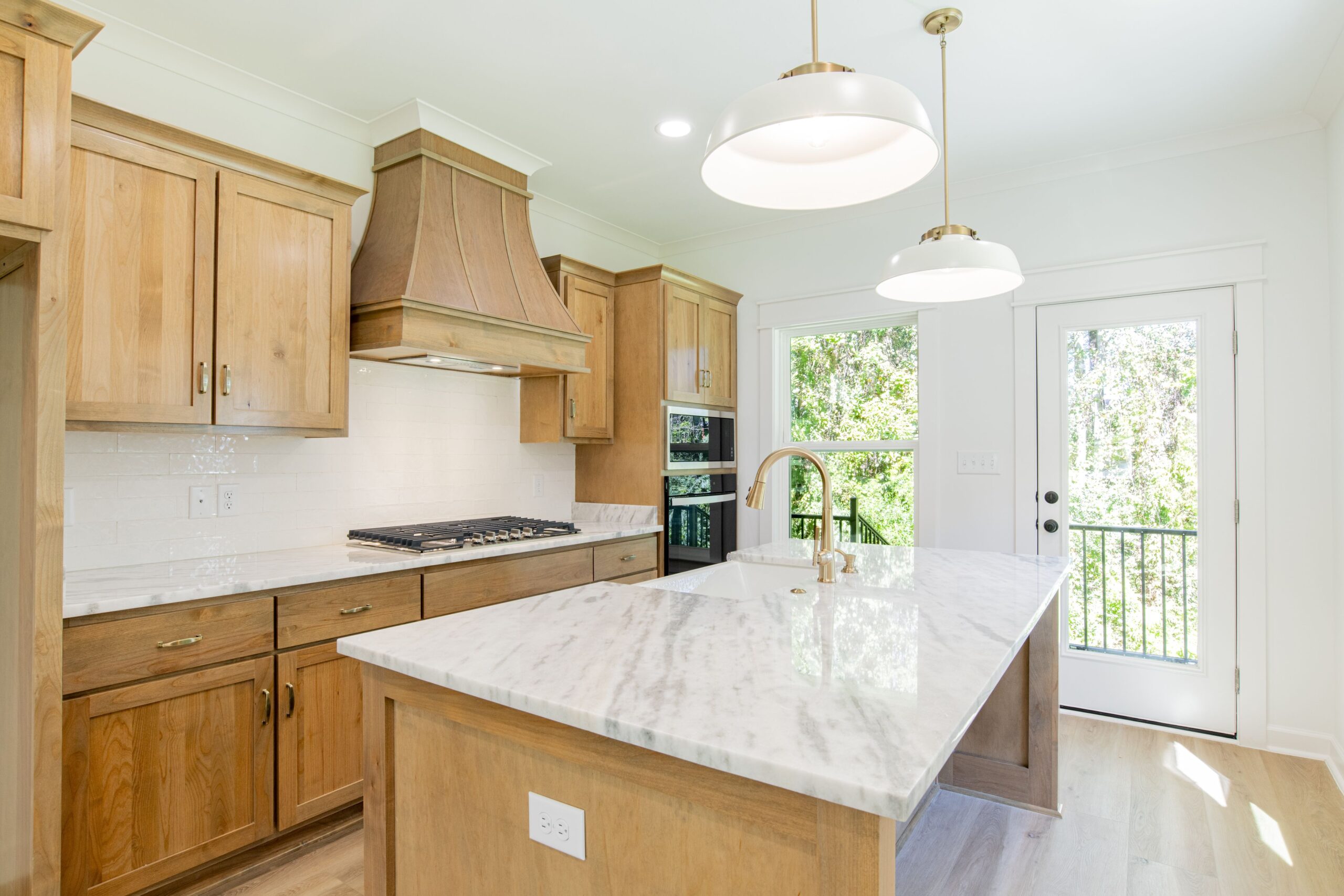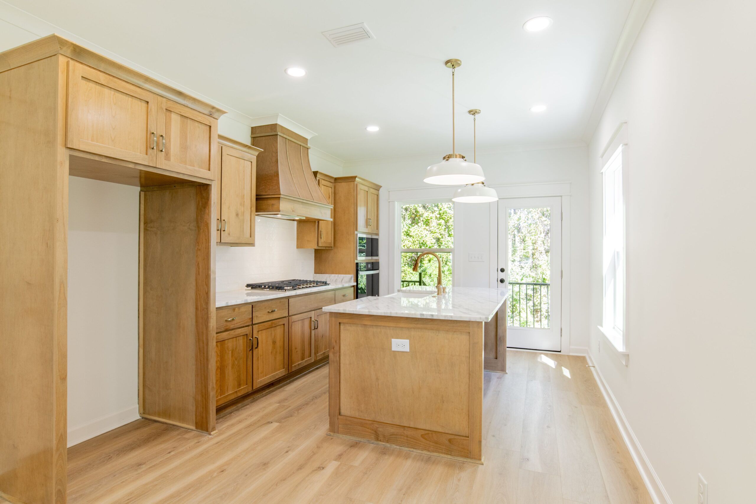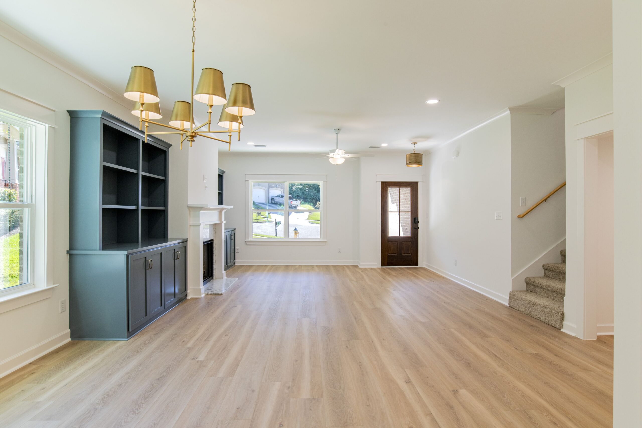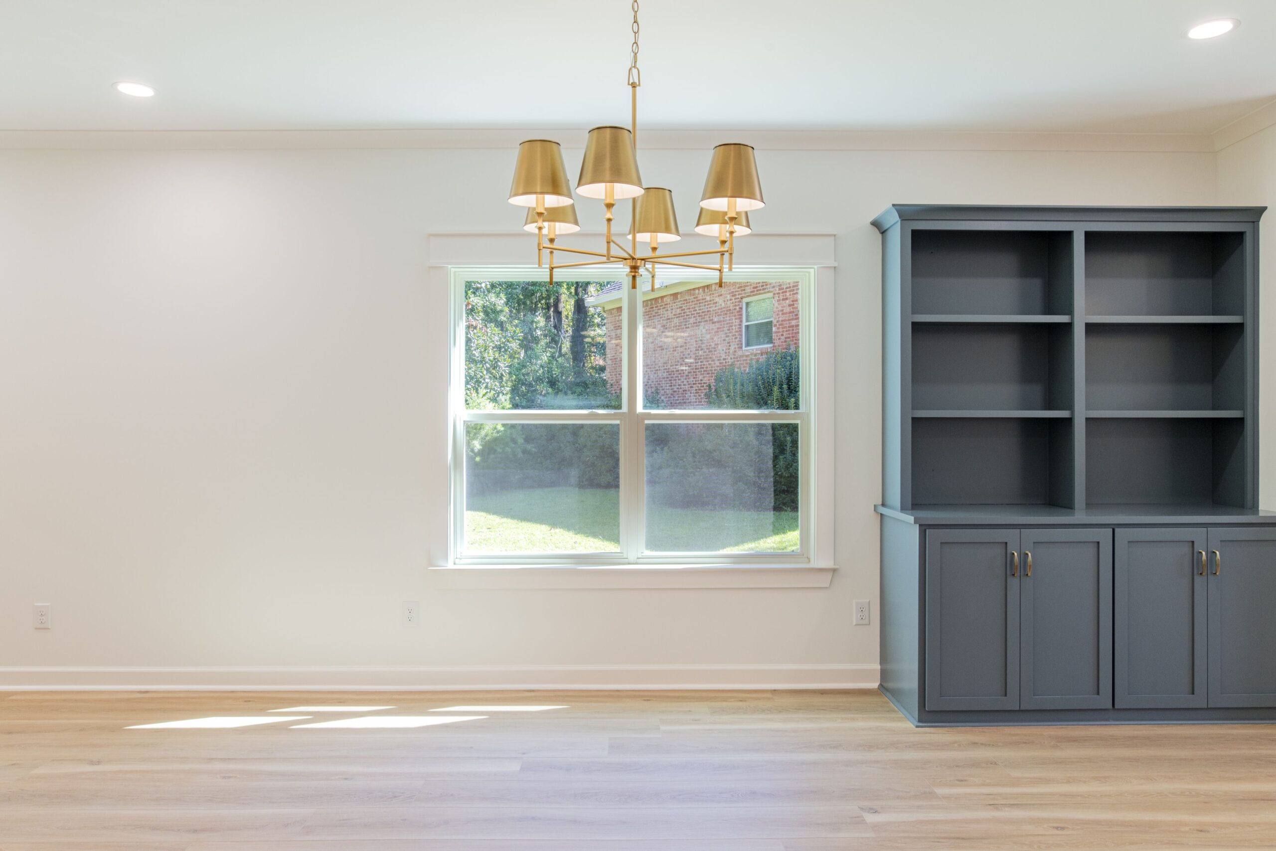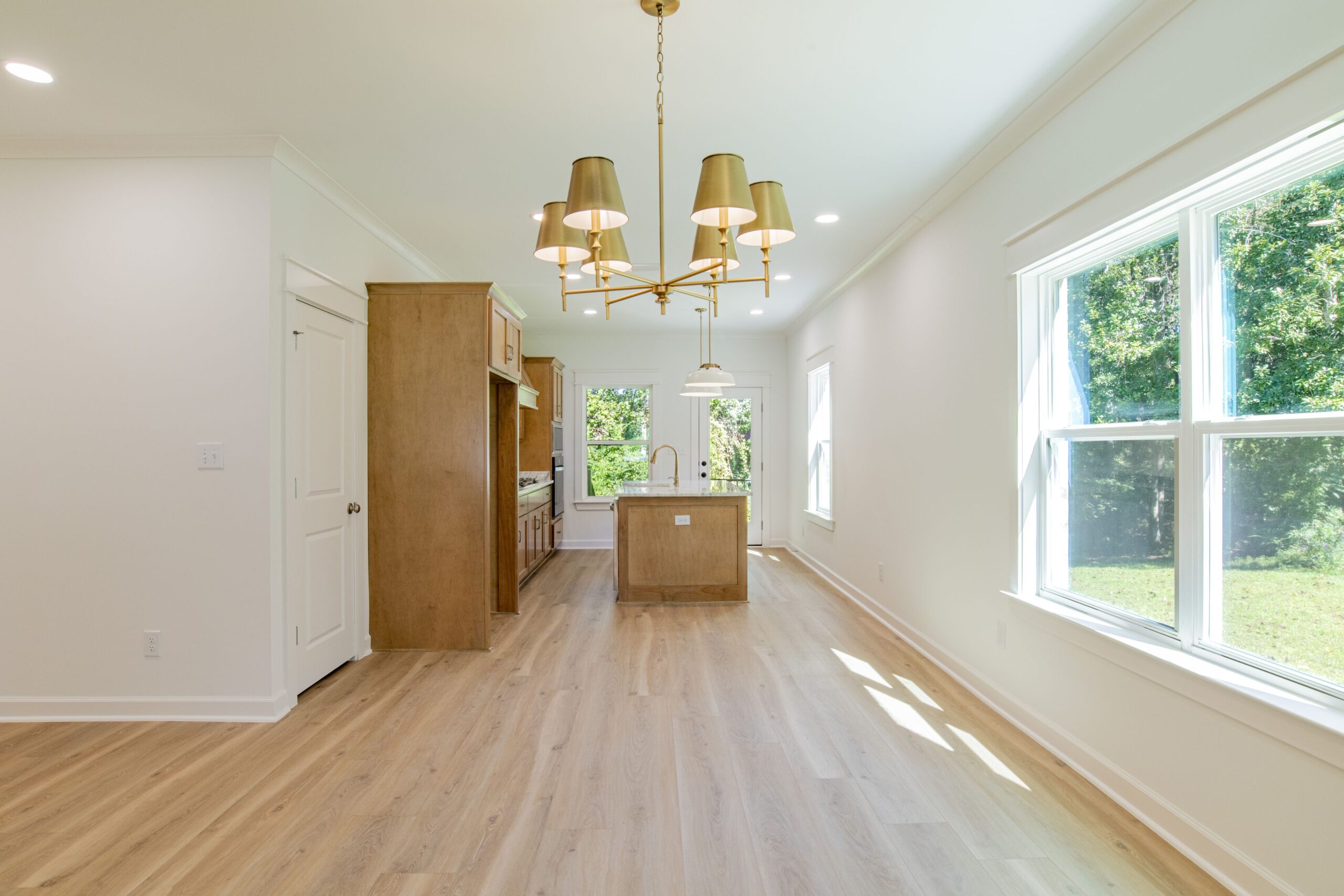 The open dining area glows with a six-light aged brass chandelier, adding an elegant touch to the space.