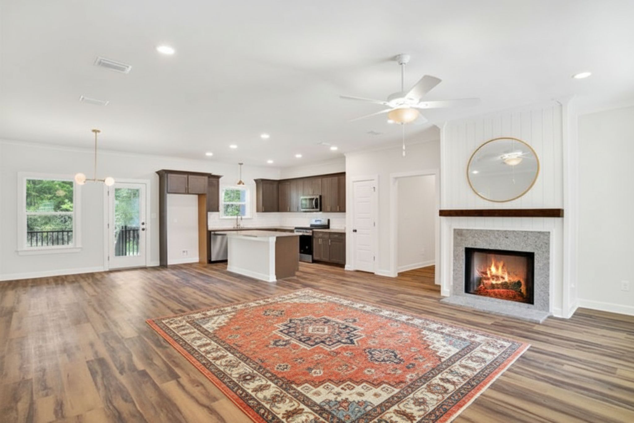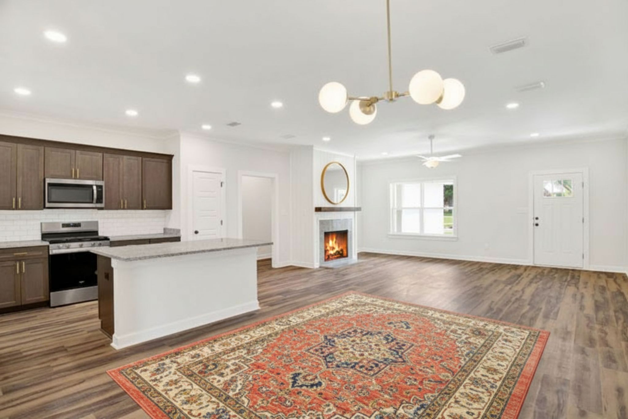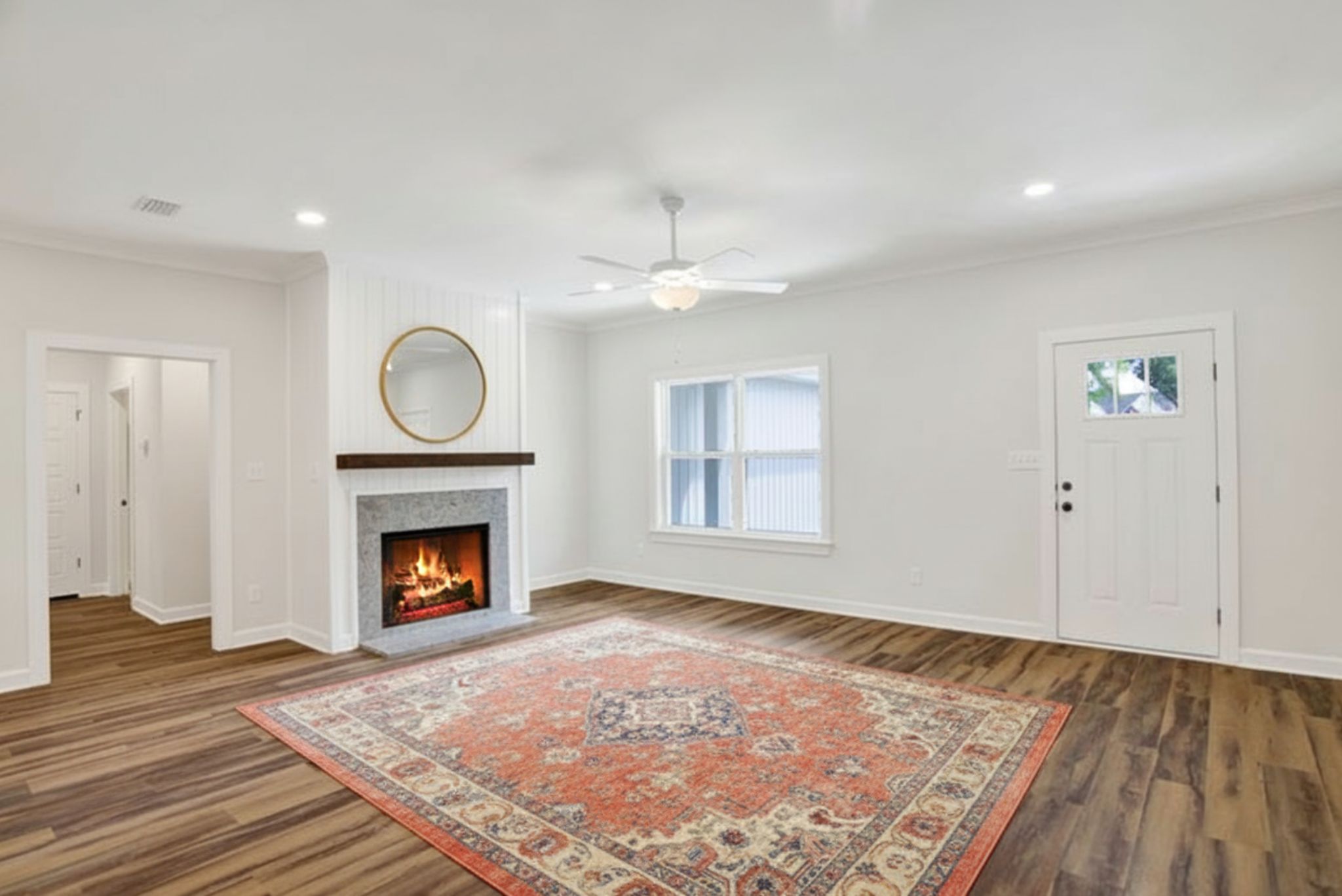 Straight ahead, the spacious living room centers around a beautiful gas brick fireplace with a cedar mantle—perfect for cozy family nights.