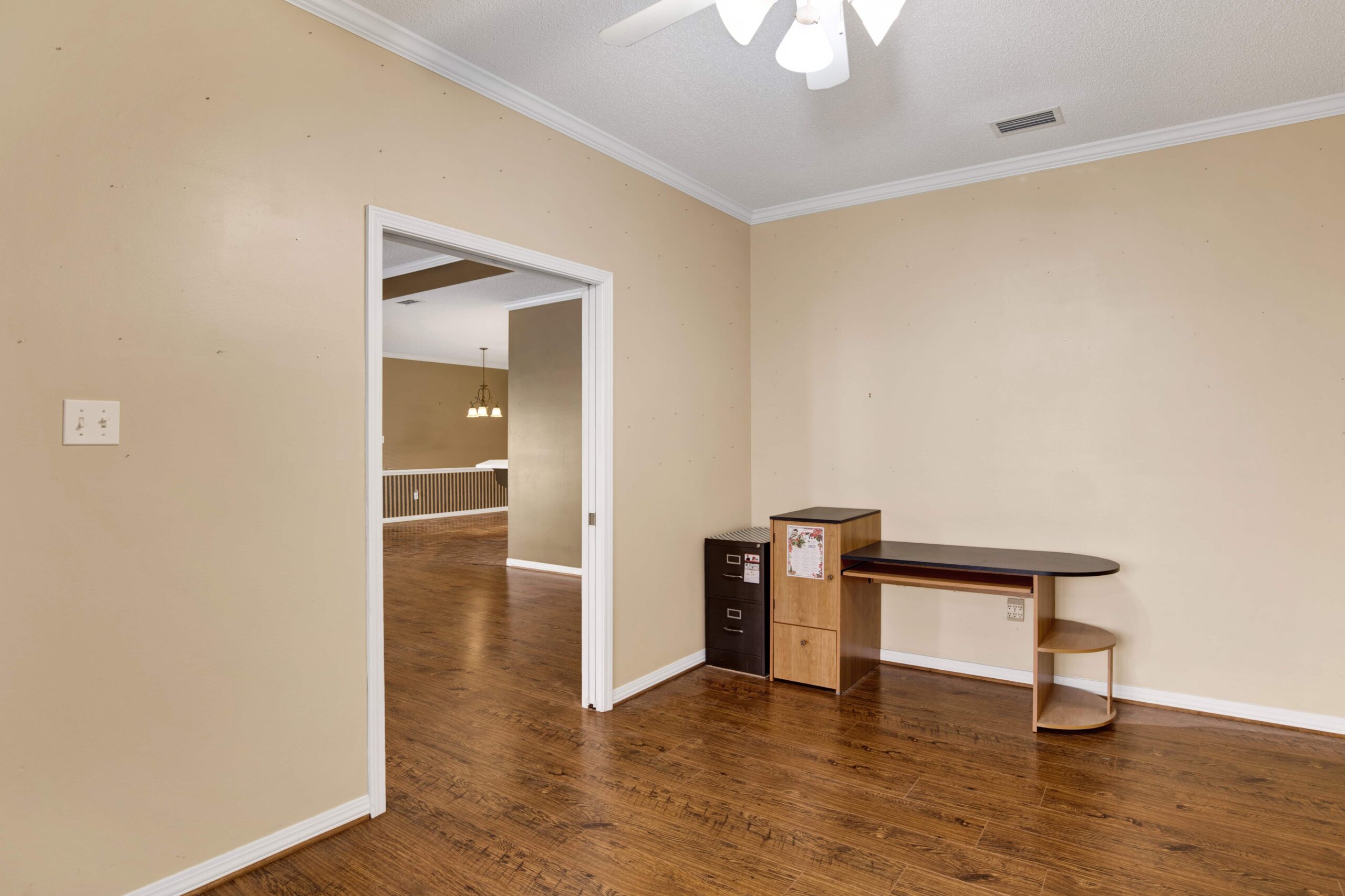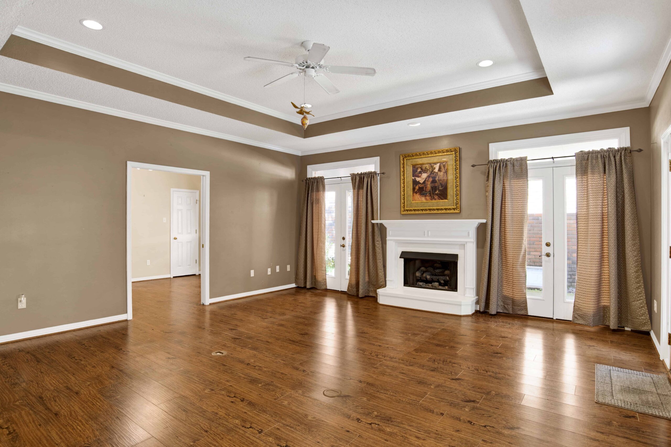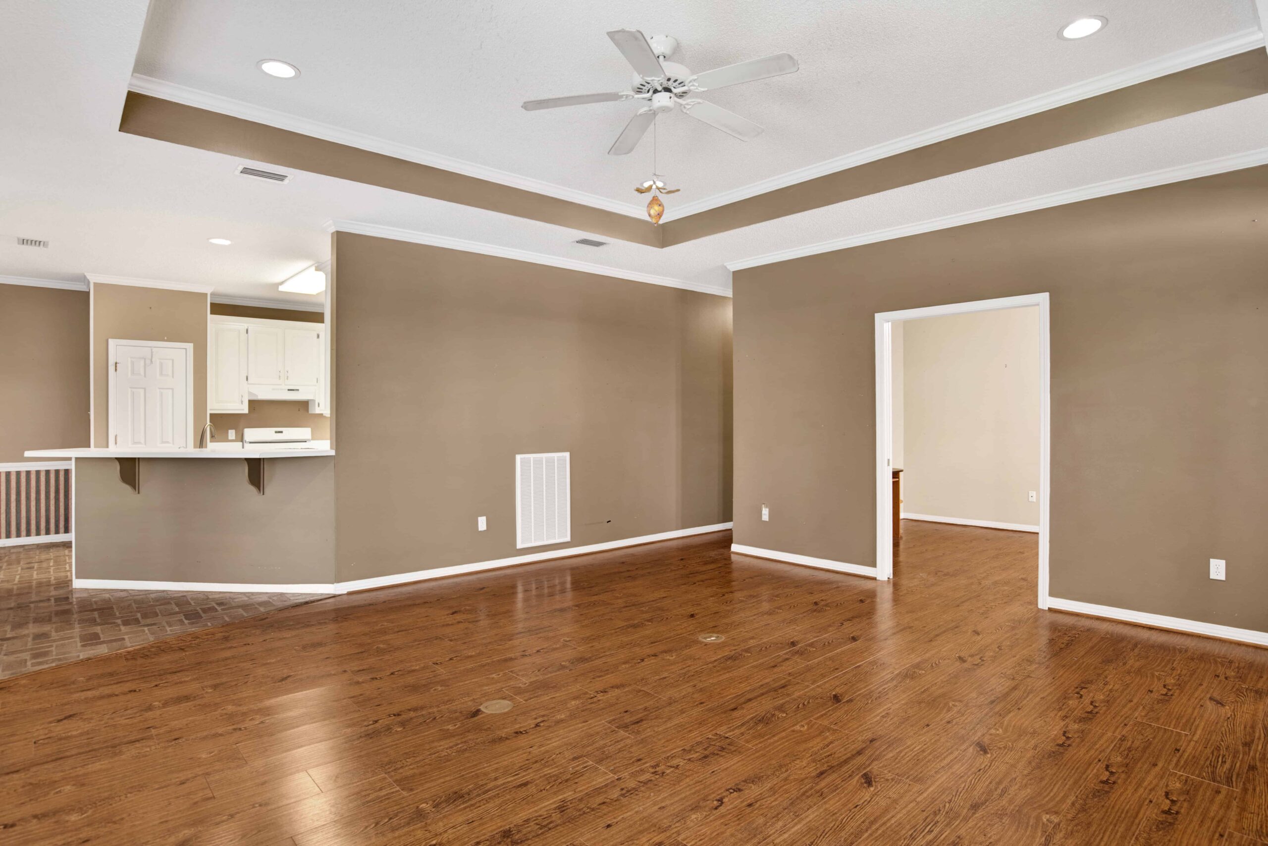 Open living area with crown molding & trey ceiling