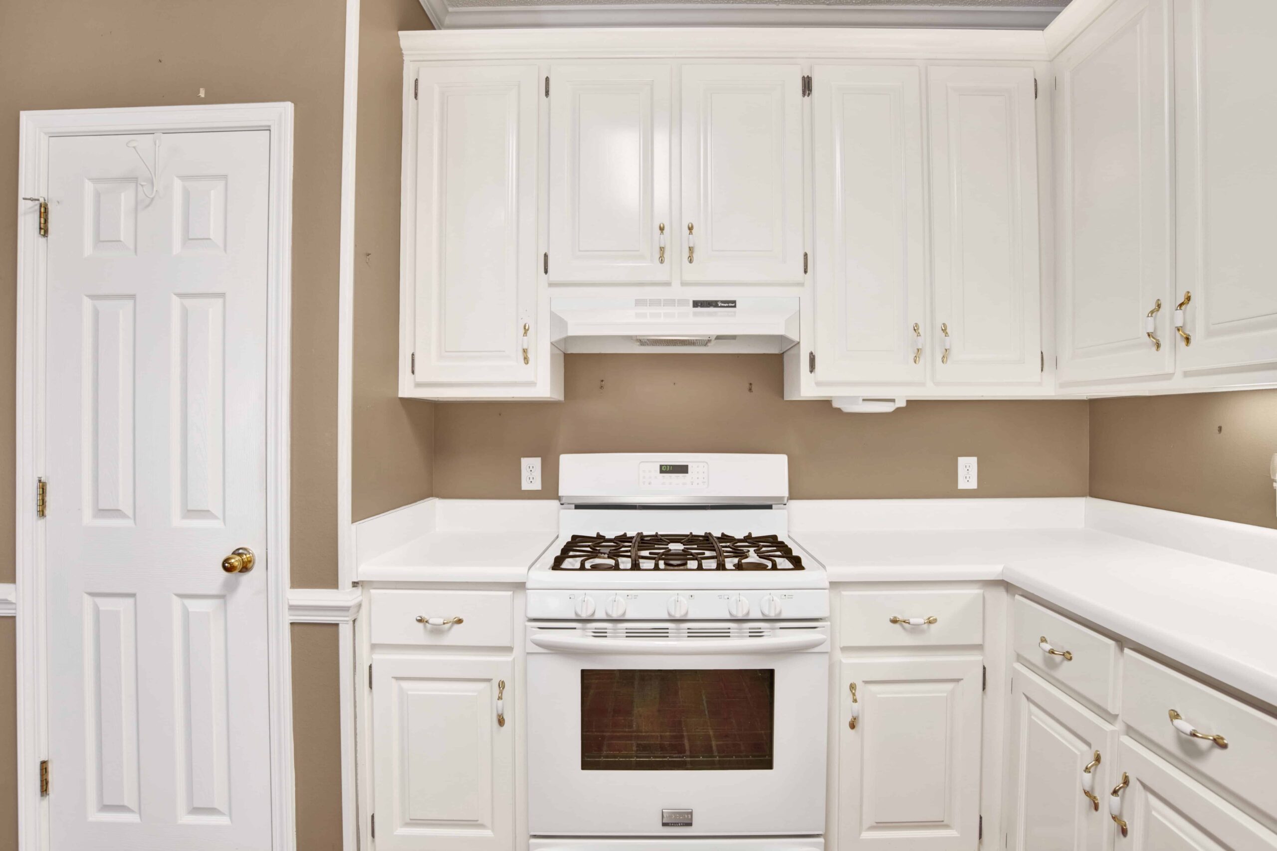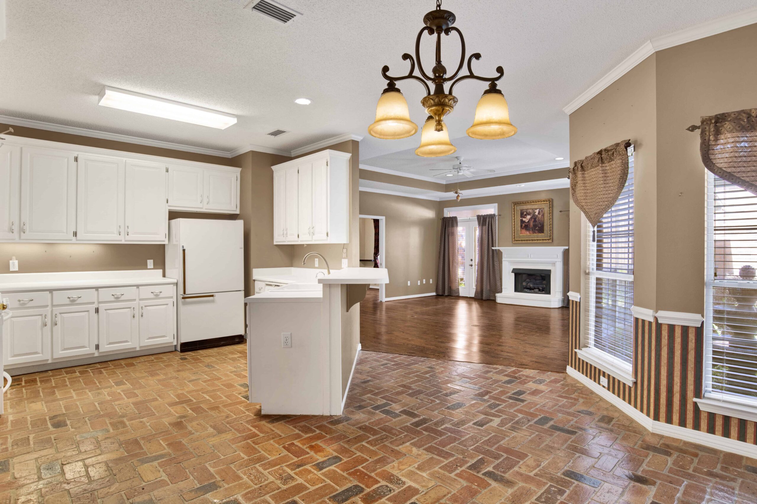 Kitchen with split brick flooring & custom cabinets