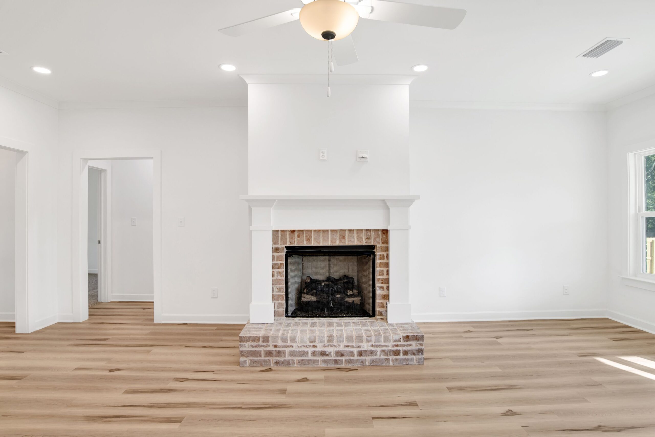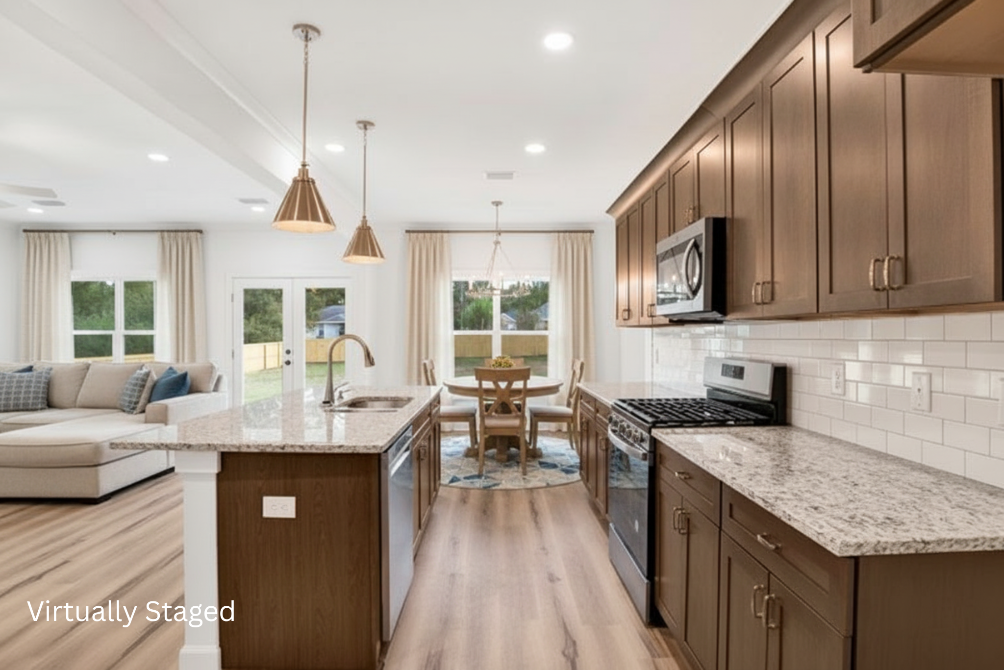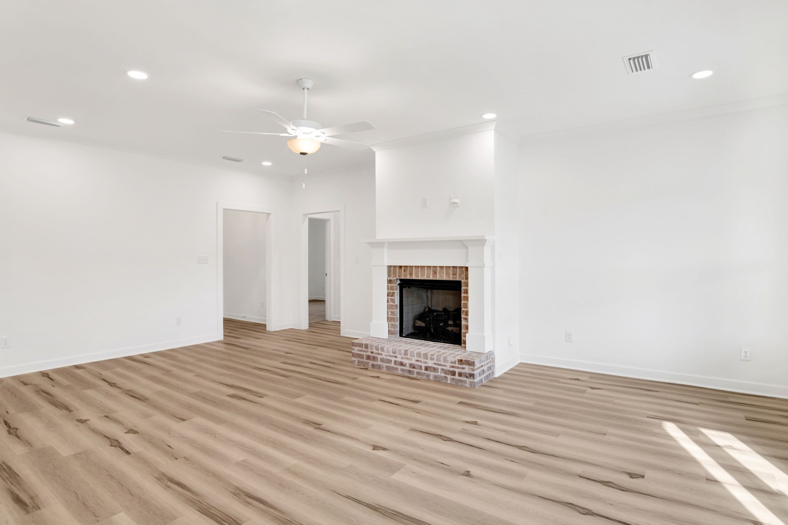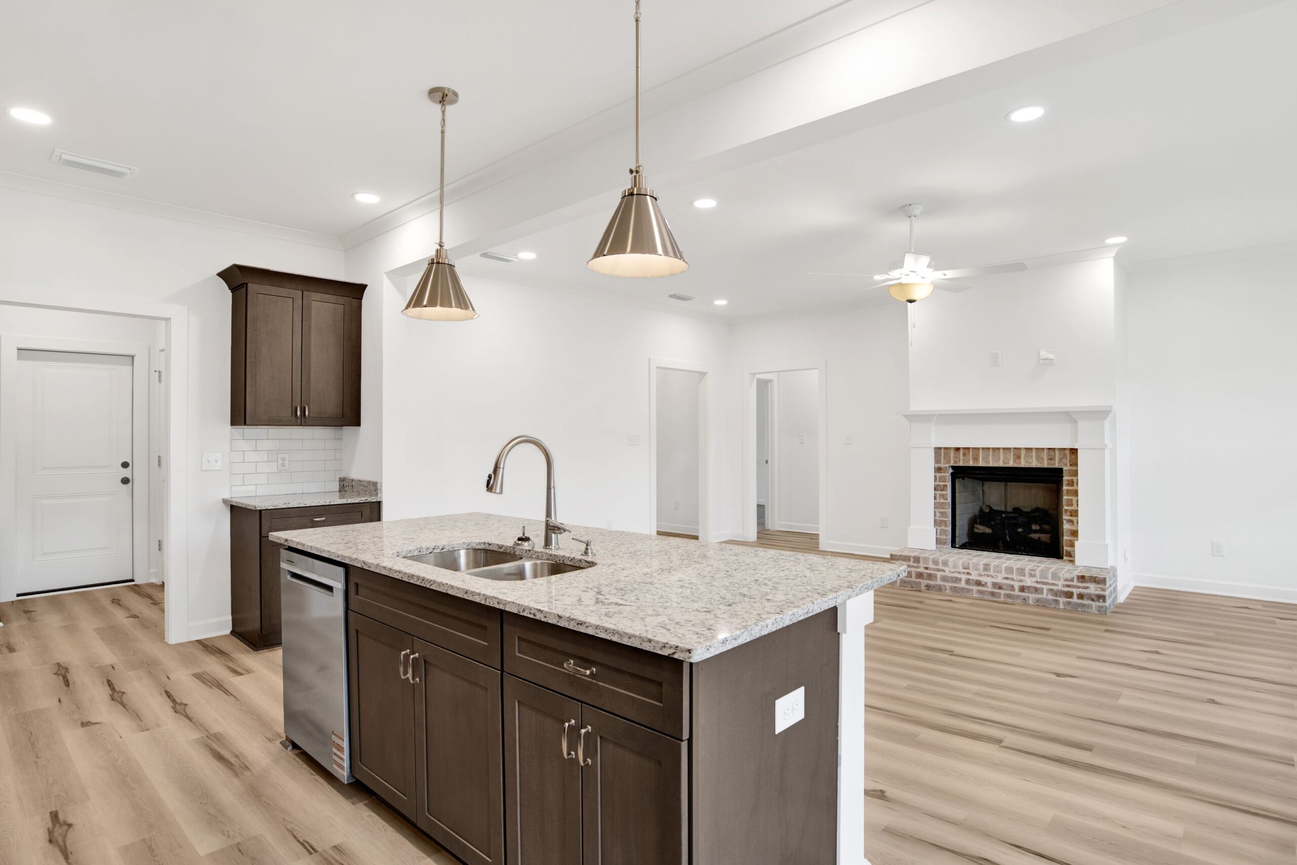 Step inside to discover warm hickory-colored LVP flooring that flows seamlessly through the home, highlighted by cove crown molding and a cozy gas fireplace with a brick inset and hearth. The open-concept design connects the living, dining, and kitchen areas — ideal for gatherings and everyday living.