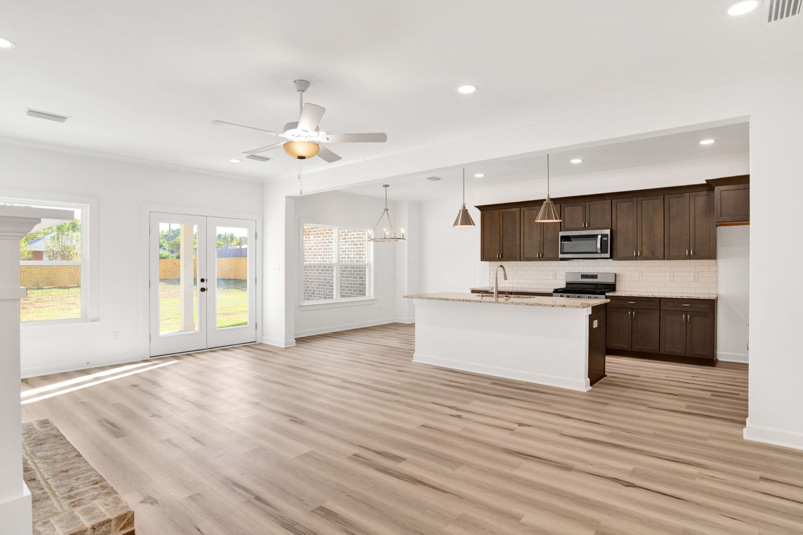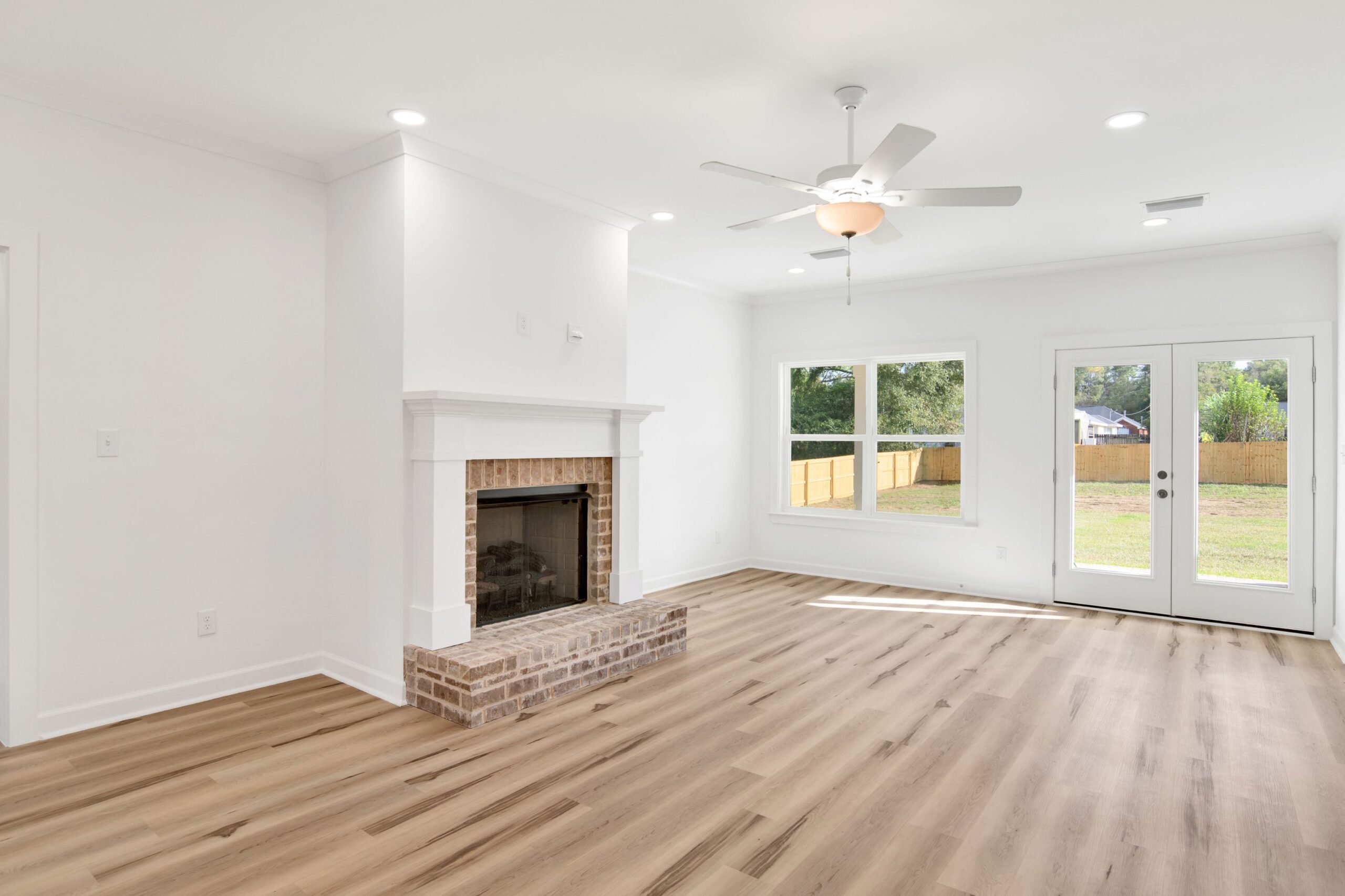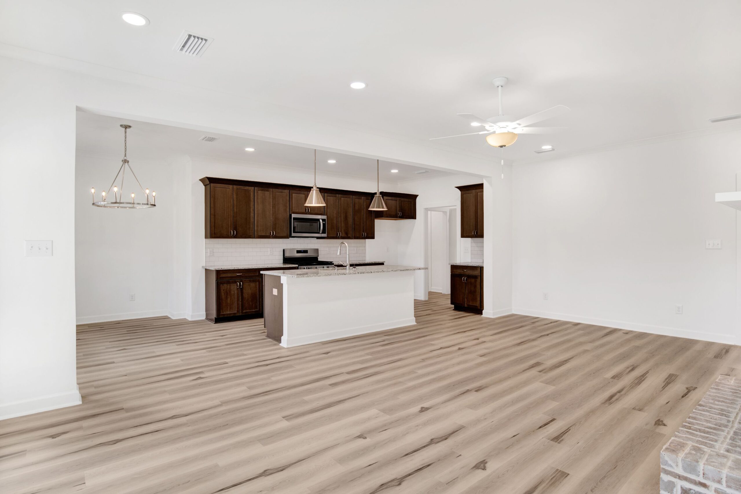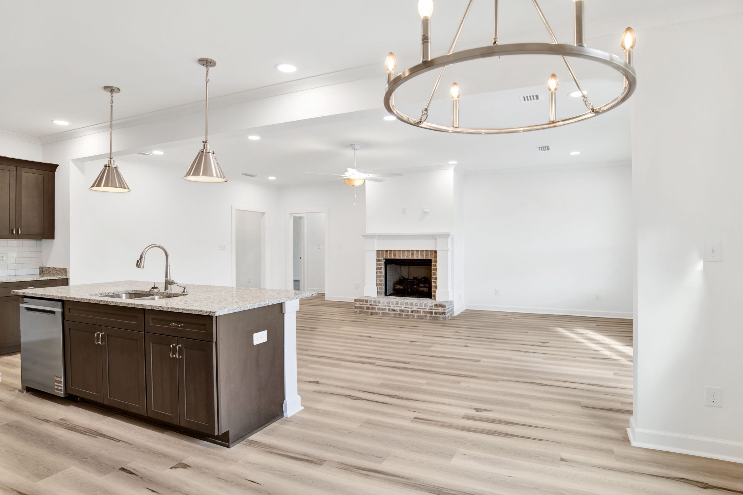 Step inside to discover warm hickory-colored LVP flooring that flows seamlessly through the home, highlighted by cove crown molding and a cozy gas fireplace with a brick inset and hearth. The open-concept design connects the living, dining, and kitchen areas — ideal for gatherings and everyday living.