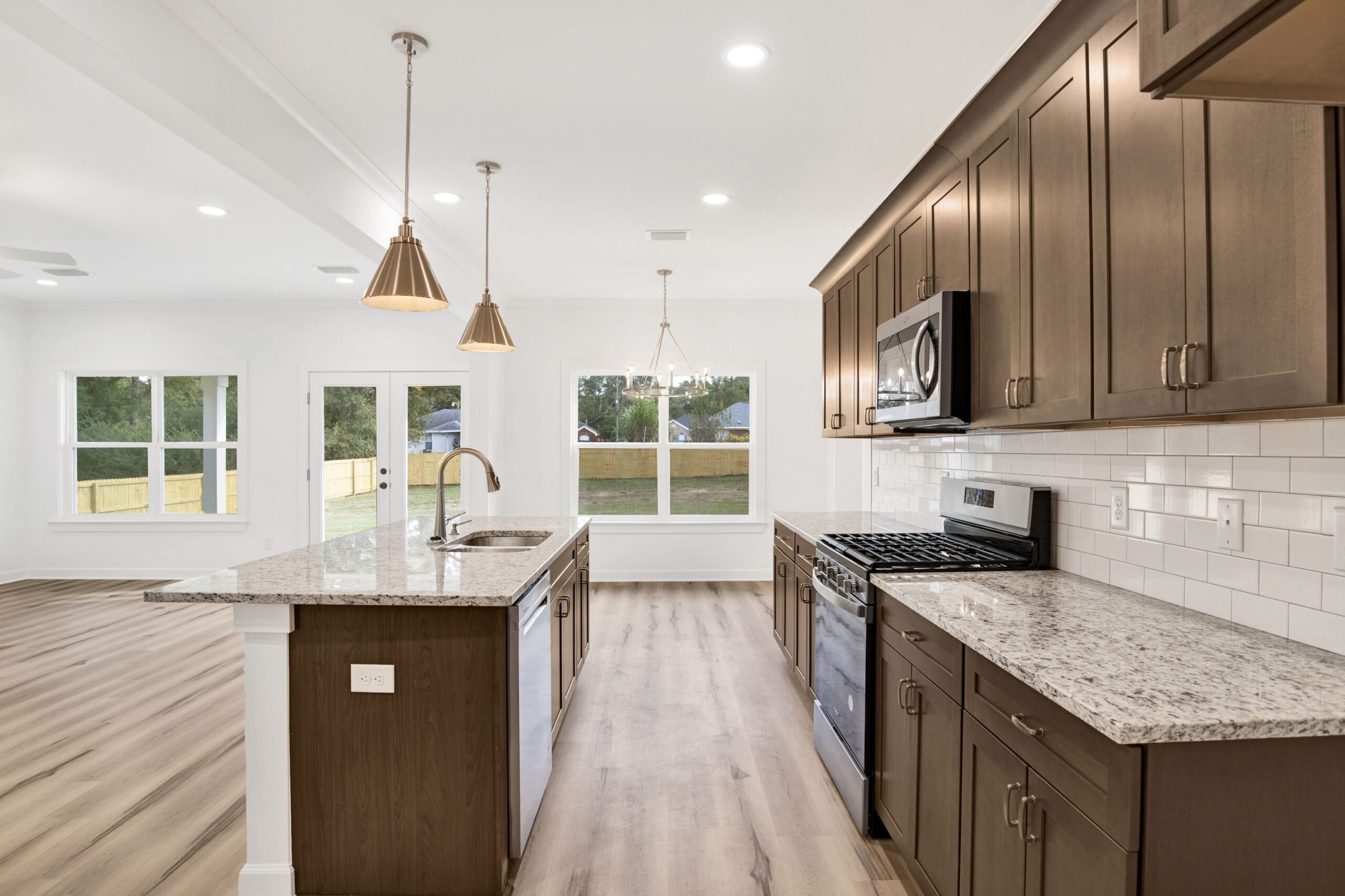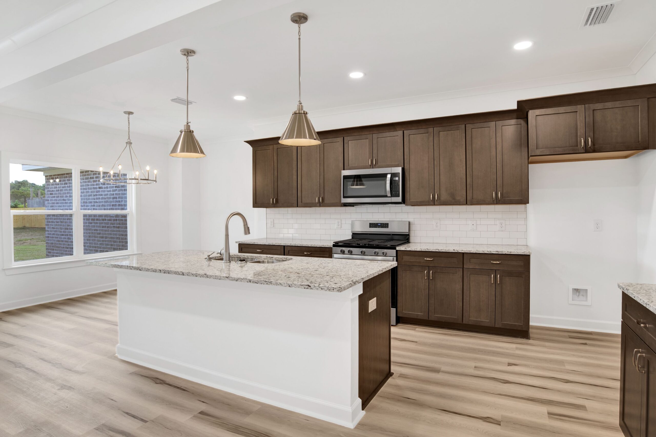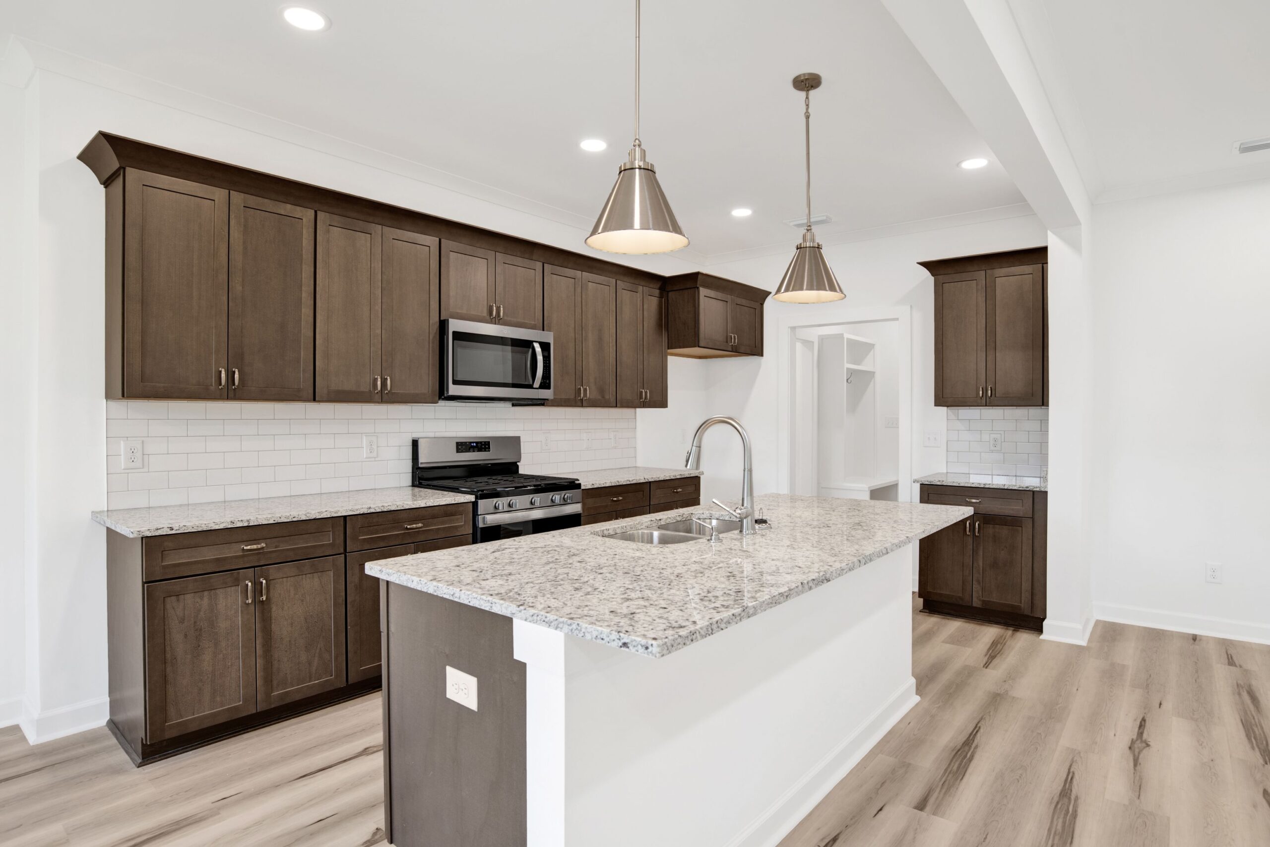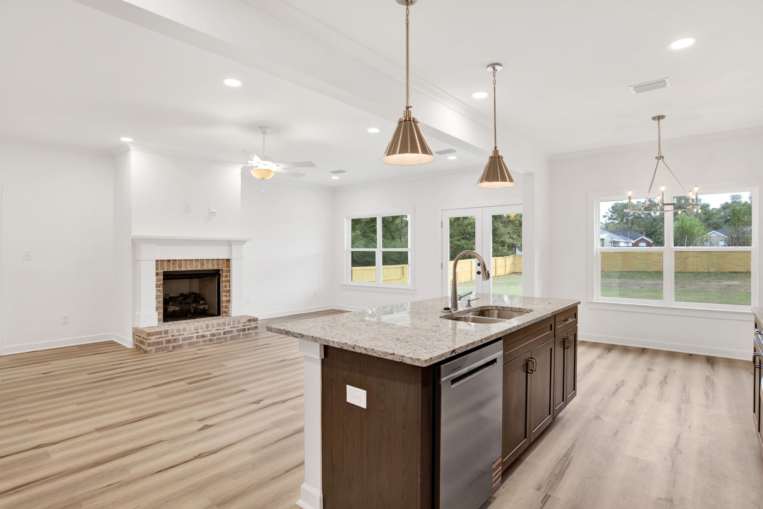 Step inside to discover warm hickory-colored LVP flooring that flows seamlessly through the home, highlighted by cove crown molding and a cozy gas fireplace with a brick inset and hearth. The open-concept design connects the living, dining, and kitchen areas — ideal for gatherings and everyday living.