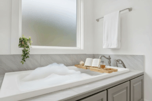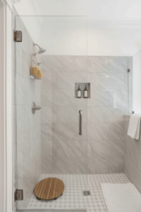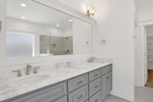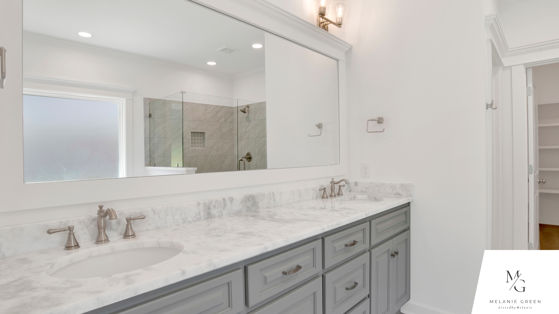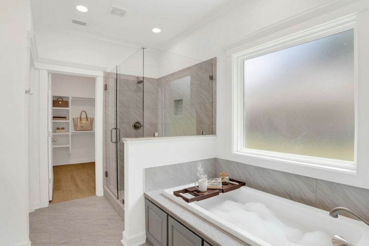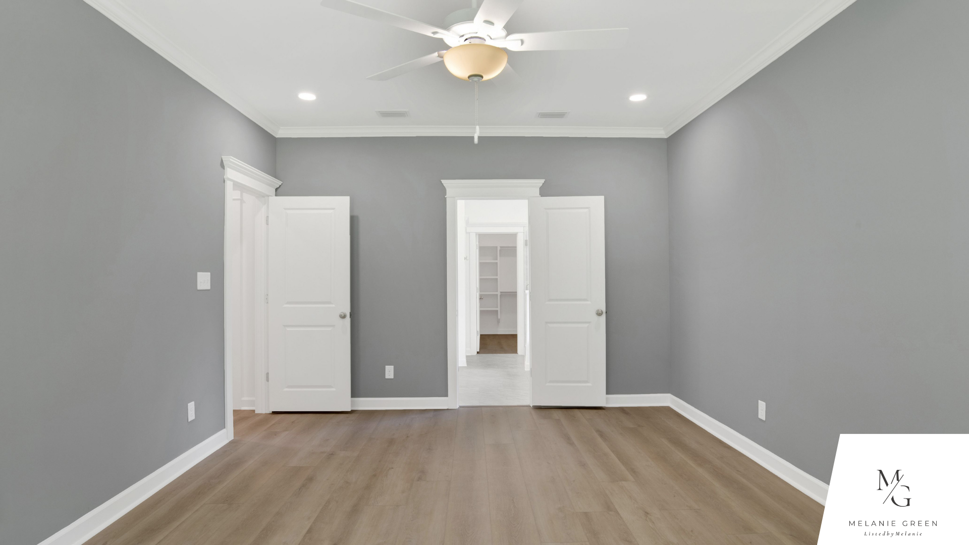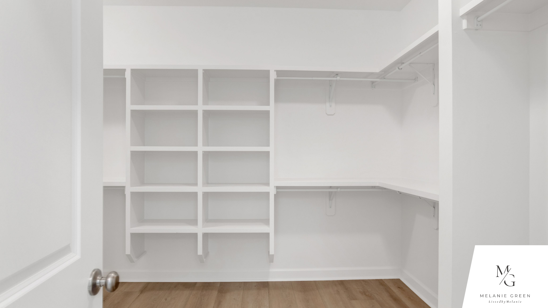 Private Primary Suite – Features a spa-like bathroom with double vanity, walk-in shower, and custom closet shelving.