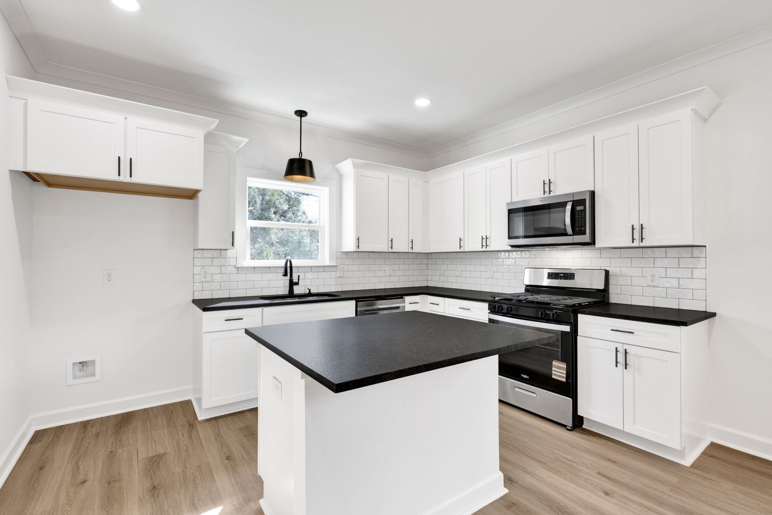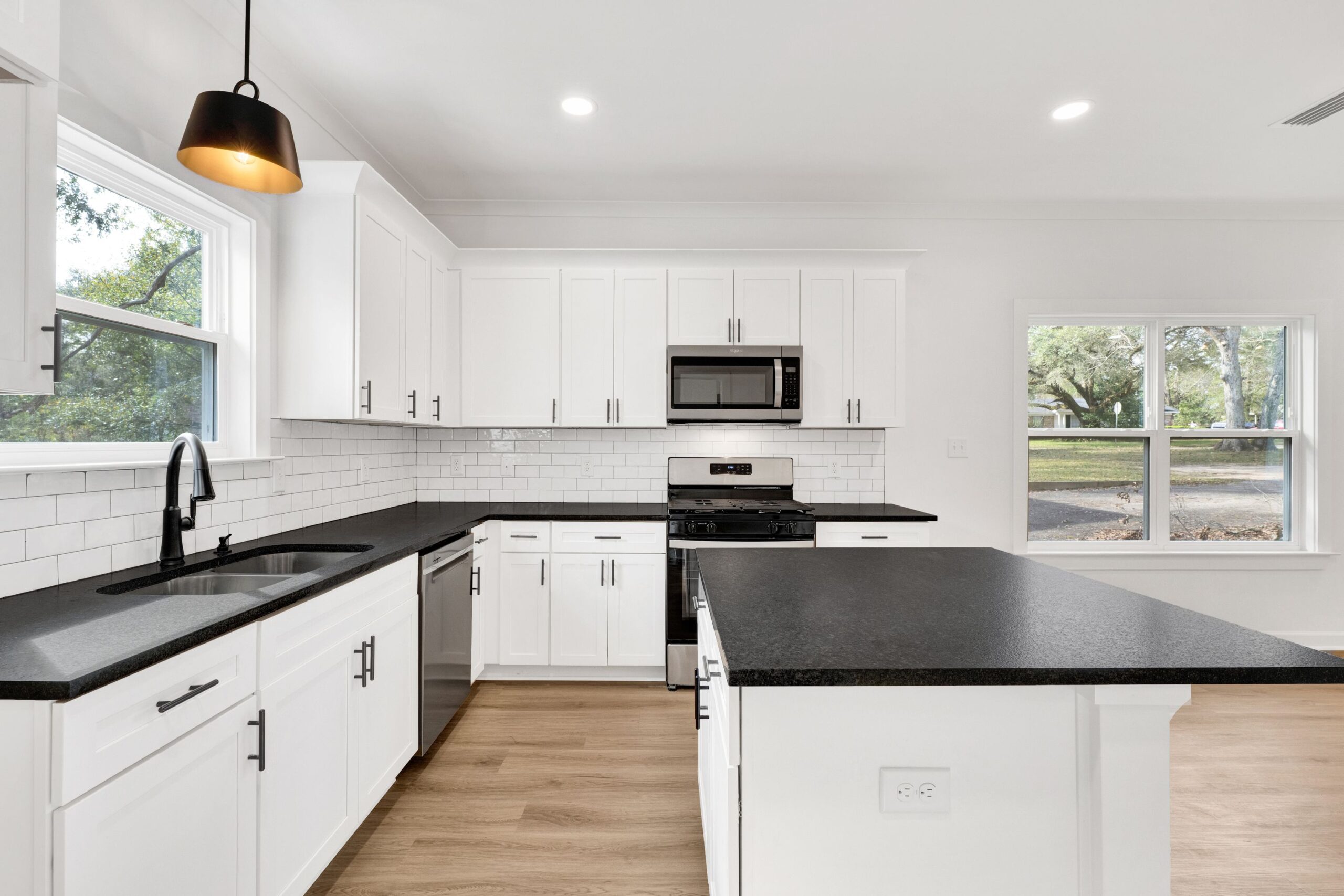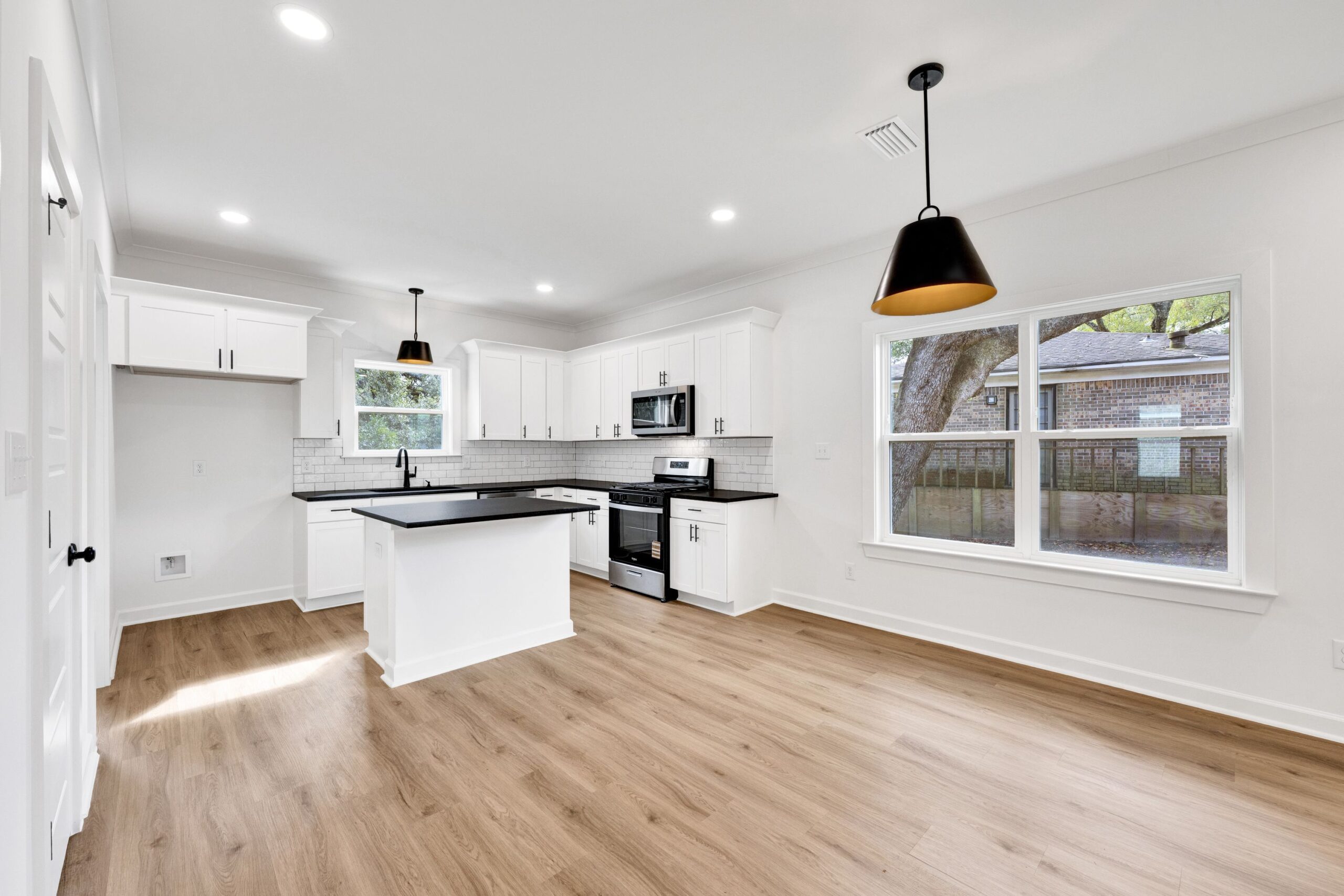Step inside to an open-concept layout filled with natural light, perfect for everyday living and entertaining. The kitchen serves as the heart of the home, featuring clean transitional finishes, modern cabinetry, durable countertops, and a functional island that flows seamlessly into the dining and living areas. Luxury vinyl plank flooring, recessed lighting, and neutral designer selections create a warm, move-in-ready feel throughout.