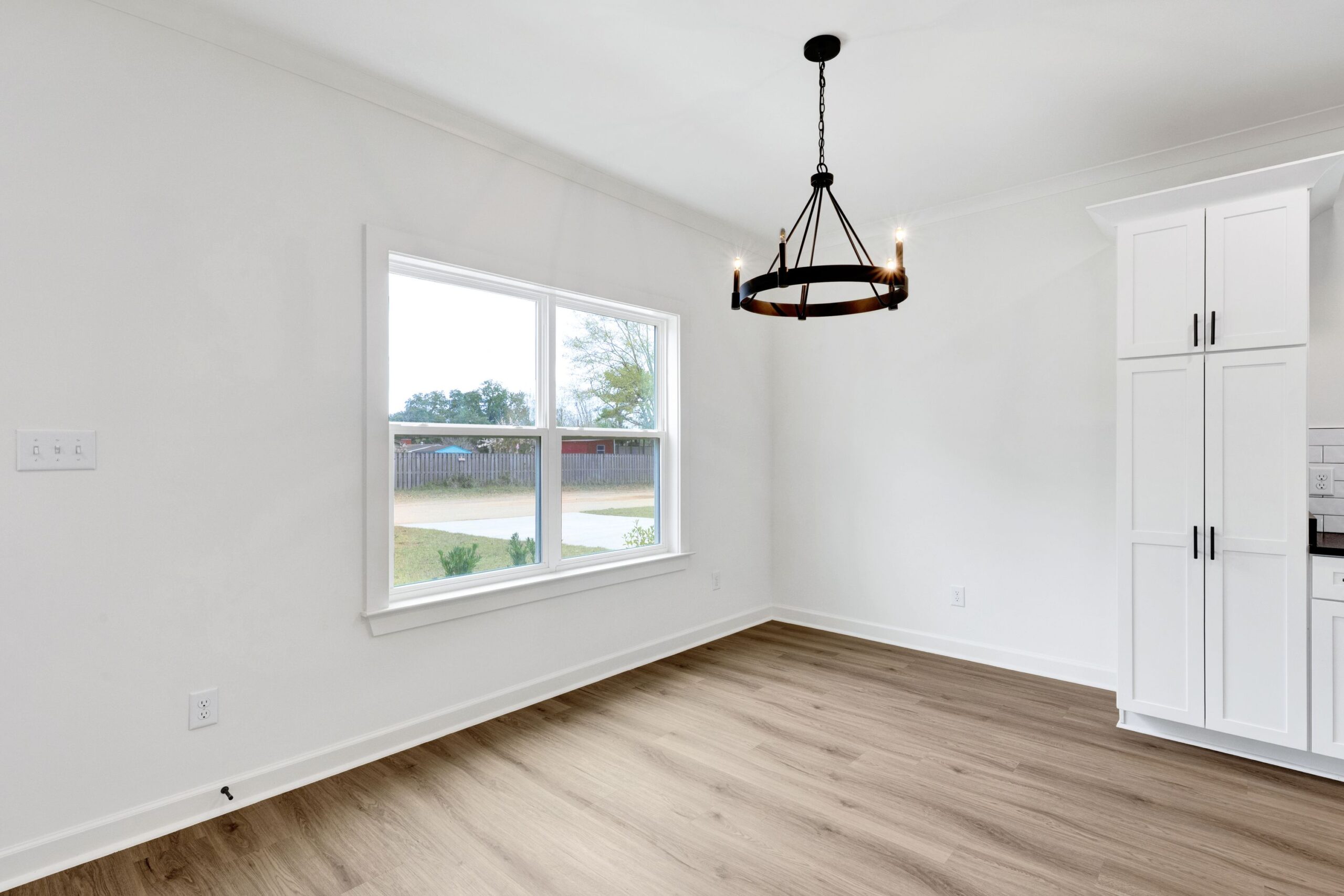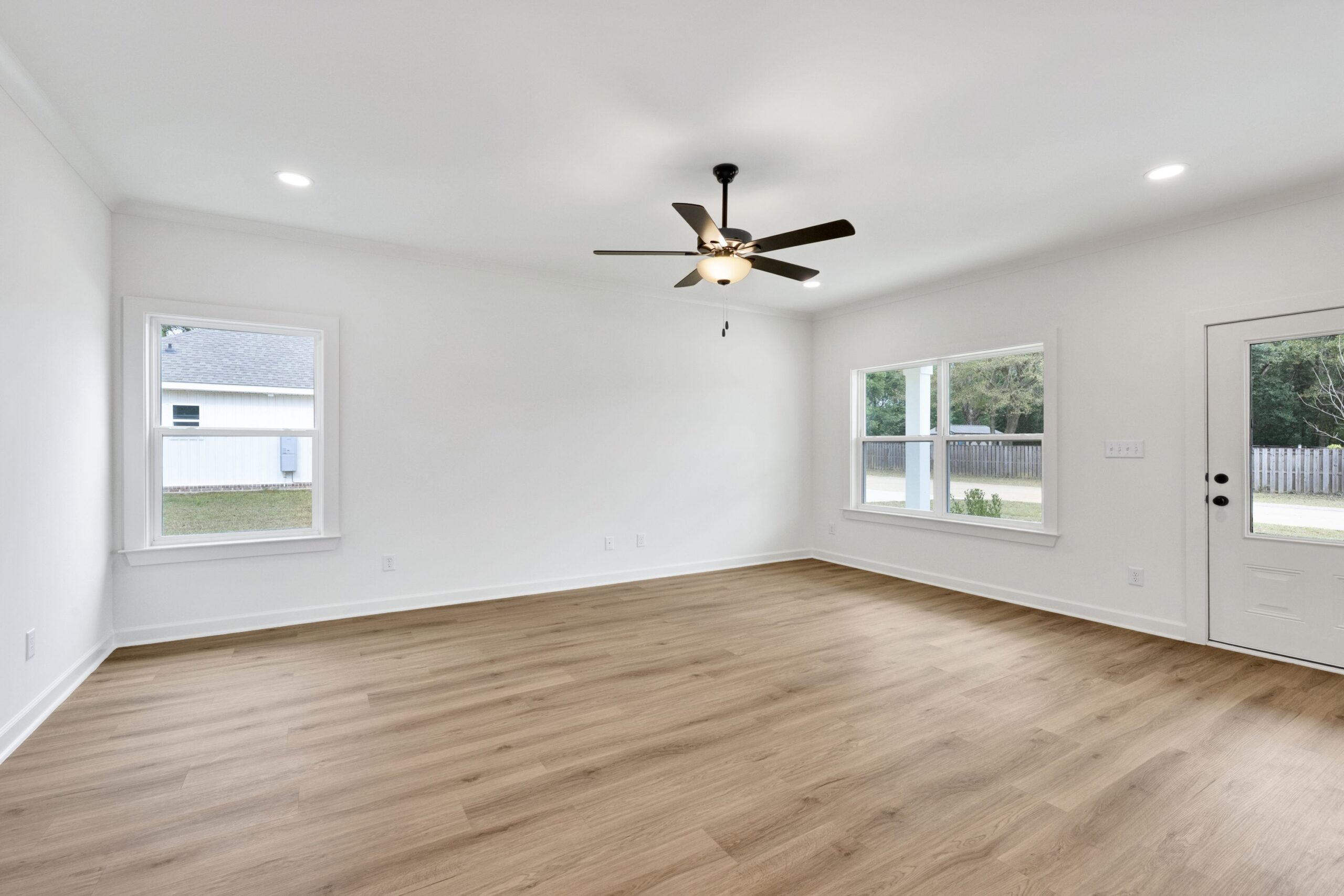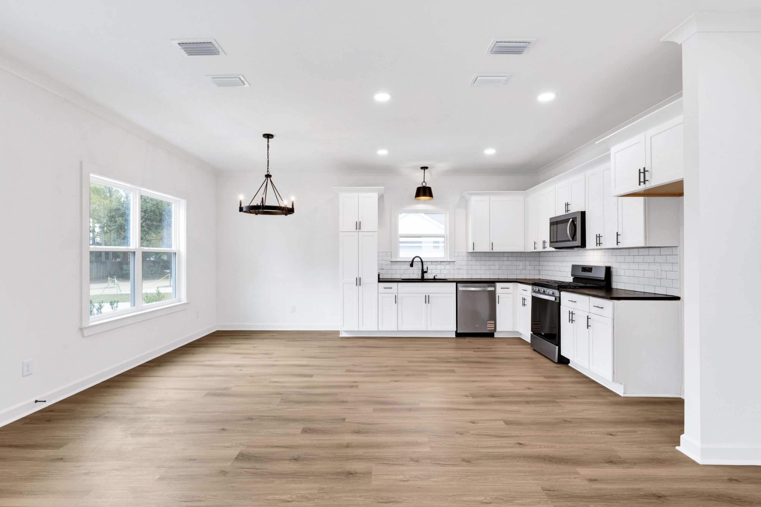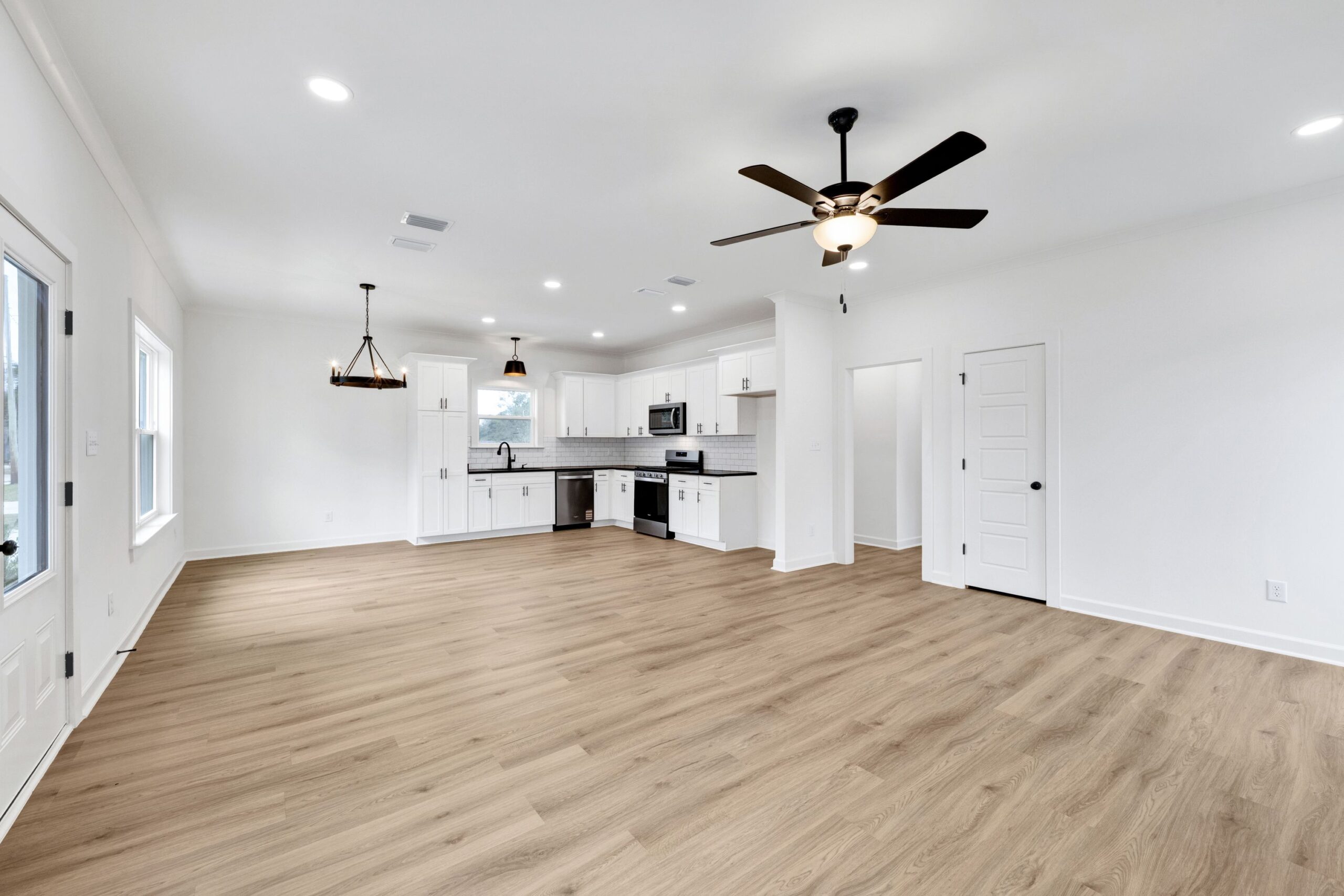 First, the exterior showcases clean farmhouse architecture with board-and-batten detailing and a covered front porch. As a result, the home offers strong curb appeal and a welcoming presence. Inside, the open-concept layout connects the living, dining, and kitchen areas. This design creates a smooth and functional flow for everyday living. Interior features include luxury vinyl plank flooring, recessed lighting, and a neutral color palette.