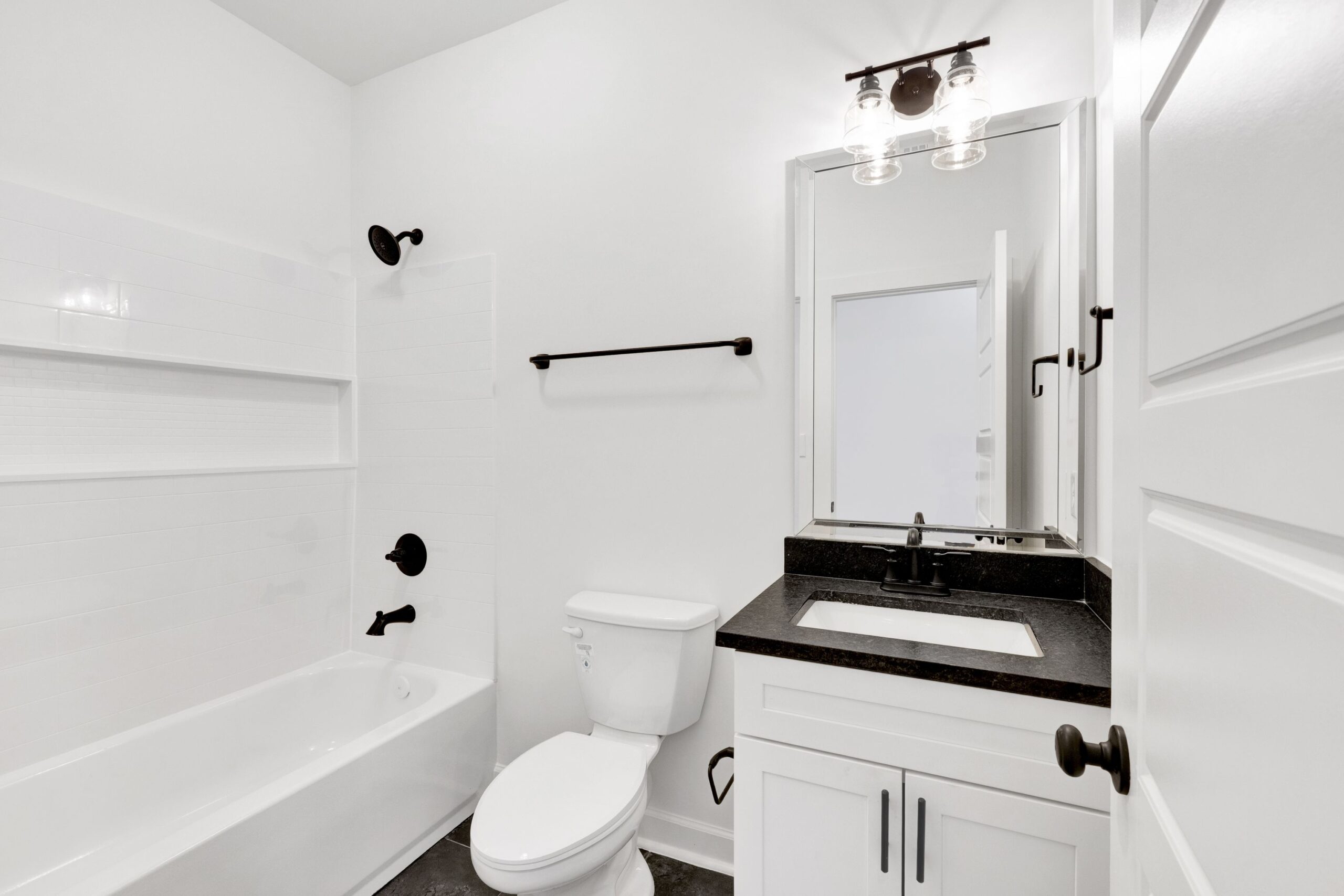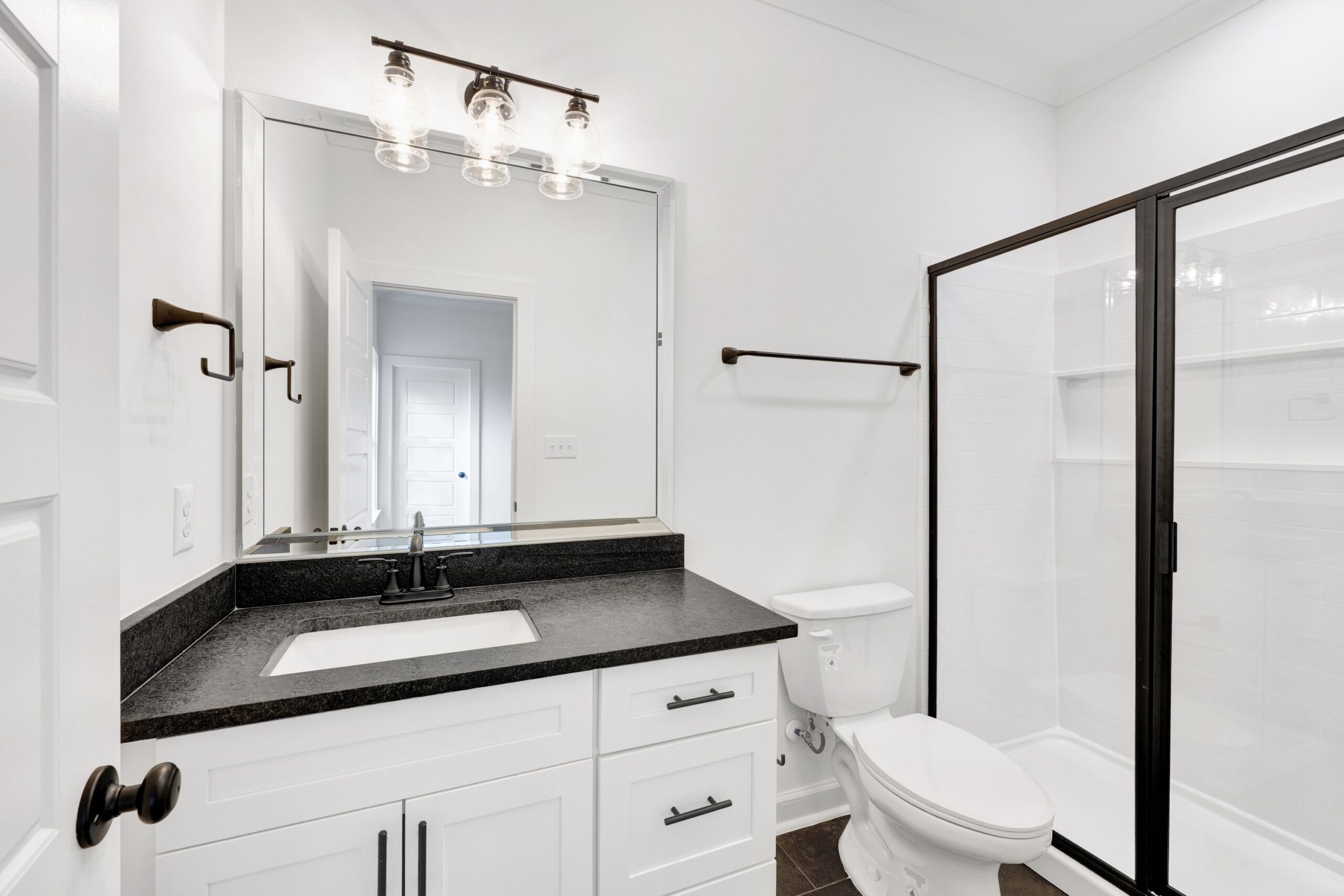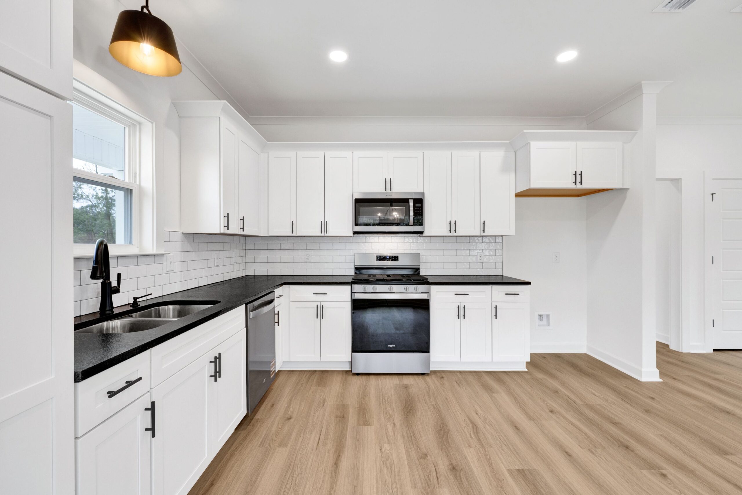Next, the kitchen blends style with practicality. It features white shaker cabinetry, a subway tile backsplash, stainless steel appliances, matte black hardware, and modern lighting. Meanwhile, the primary suite provides a private retreat with a walk-in shower, modern black fixtures, a framed mirror, and generous closet space. Two additional bedrooms add flexibility for guests, a home office, or family living.